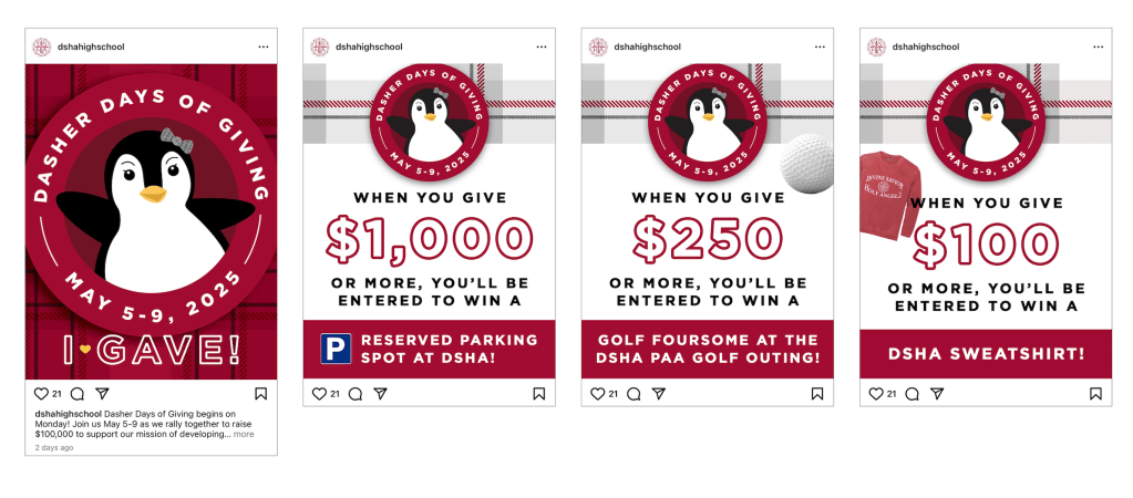 As the lead designer for Dasher Days of Giving, I oversee all visual aspects of this evolving annual fundraiser event. My responsibilities include designing print collateral, email marketing assets, and social media graphics. Each year, the campaign has grown in scale and impact—this year expanding to a full week of giving—and the design has adapted to reflect that evolution.