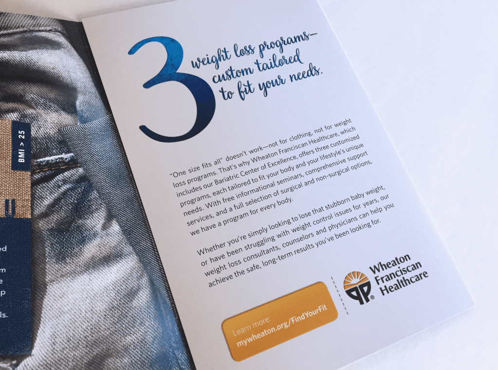 This direct mail piece promoted the Bariatric Center’s three specialized weight loss programs, targeting prospective patients with a message of support, empowerment, and medical expertise. As Assistant Art Director, I worked under the guidance of the Senior Art Director and collaborated with a photographer, writer, and creative director to bring the concept to life. Some of my contributions included layout assistance, visual development, and designing/concepting of the tags. The final piece was both informative and approachable—designed to encourage recipients to take the first step toward a healthier future.